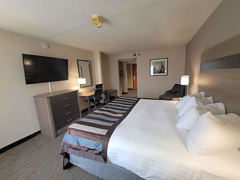 This spacious suite features a seating area with a sofa bed, flat-screen HDTV and desk. A microwave, refrigerator and coffee maker are also included.