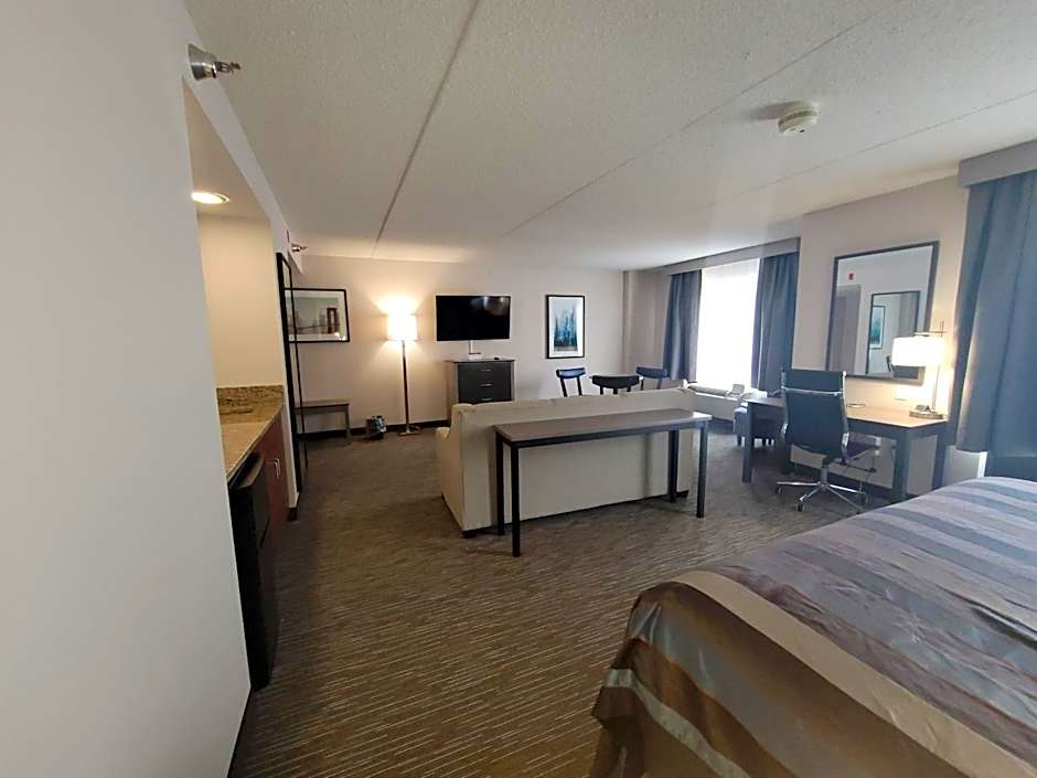 This suite includes a seating area with a sofa bed, flat-screen HDTV and desk. A microwave, refrigerator and coffee maker are also provided.